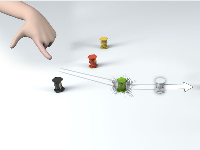 À vez, os jogadores empurram com um só dedo as peças pelo terreno de jogo com o objetivo de marcar golos ao adversário.